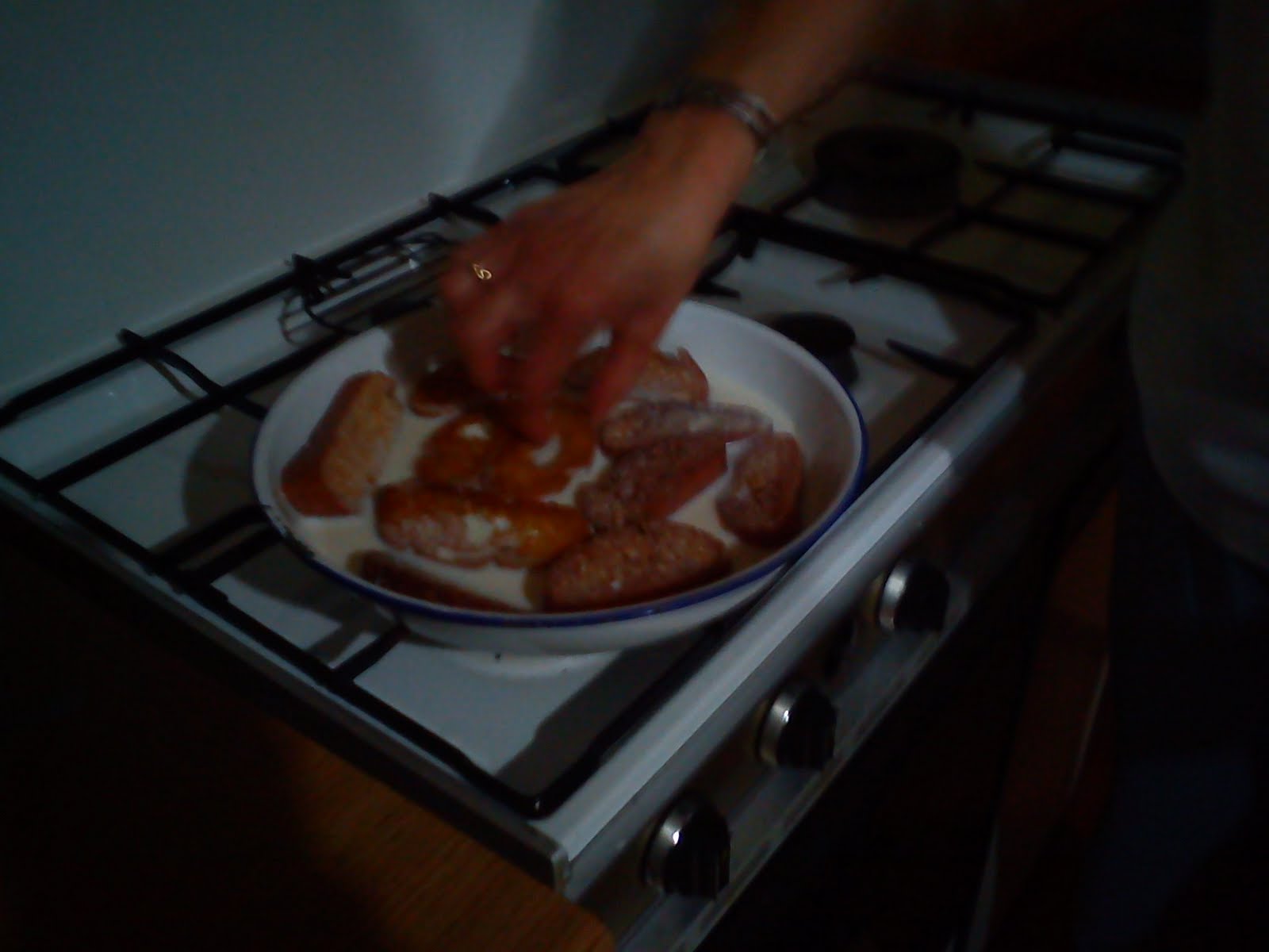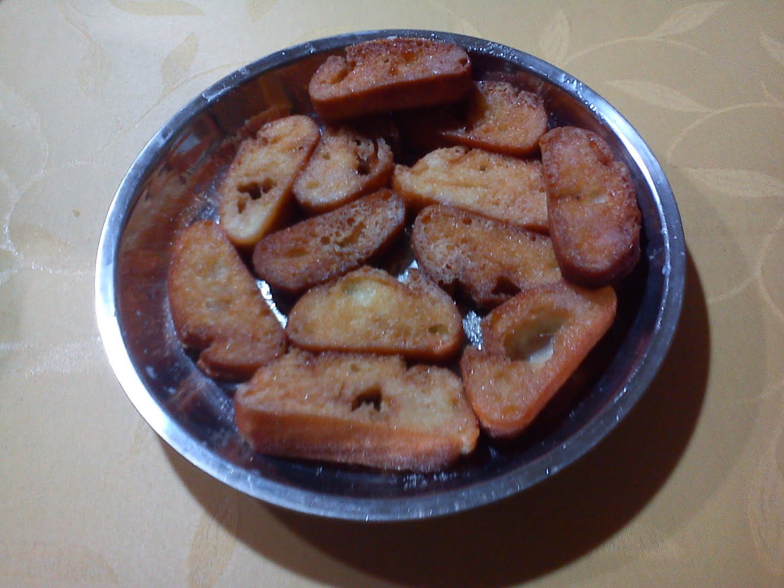 Se caliente el aceite, se hacen los picatostes, se caliente la leche y se mojan un poco(sin empapar mucho)y se les pone el azúcar.